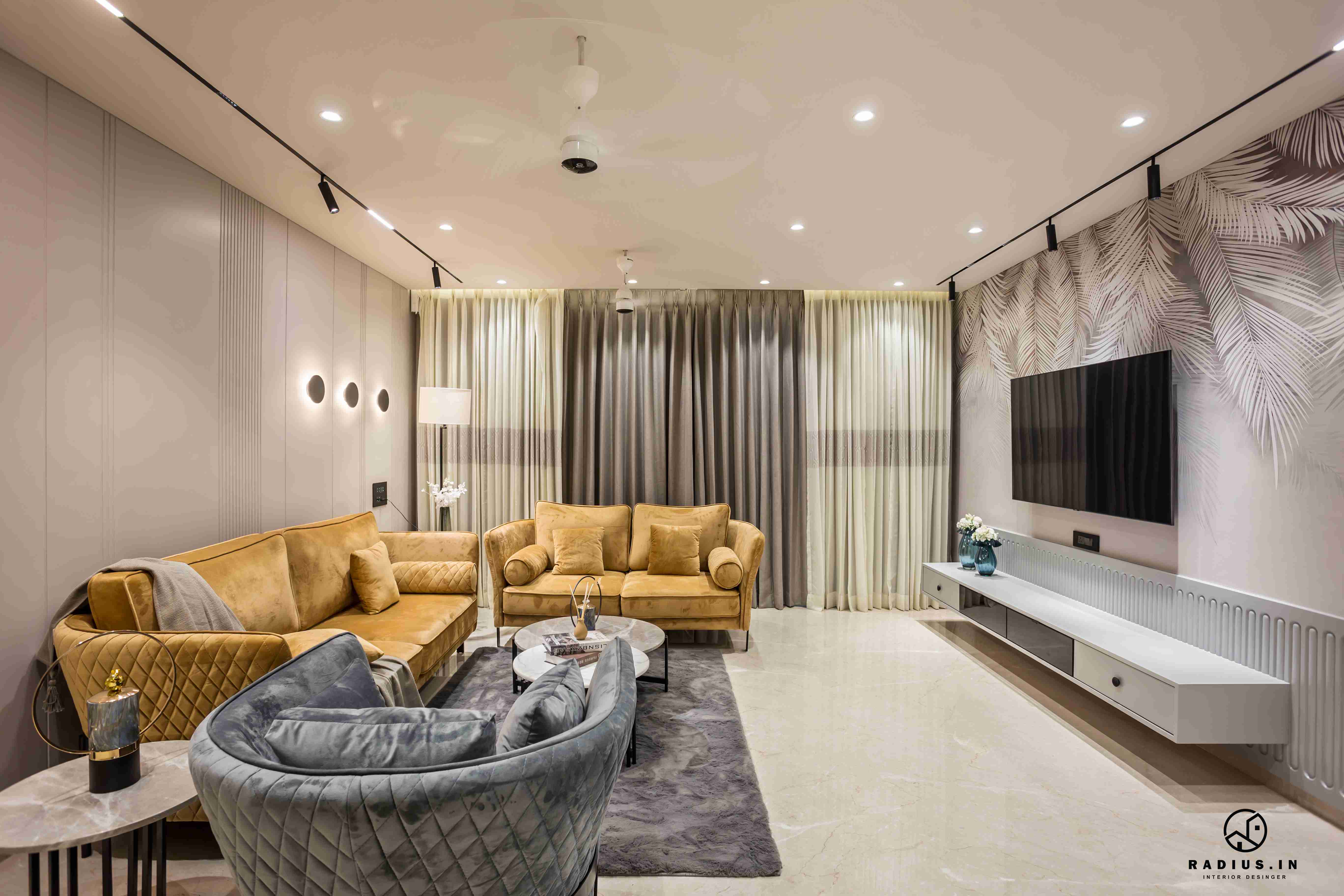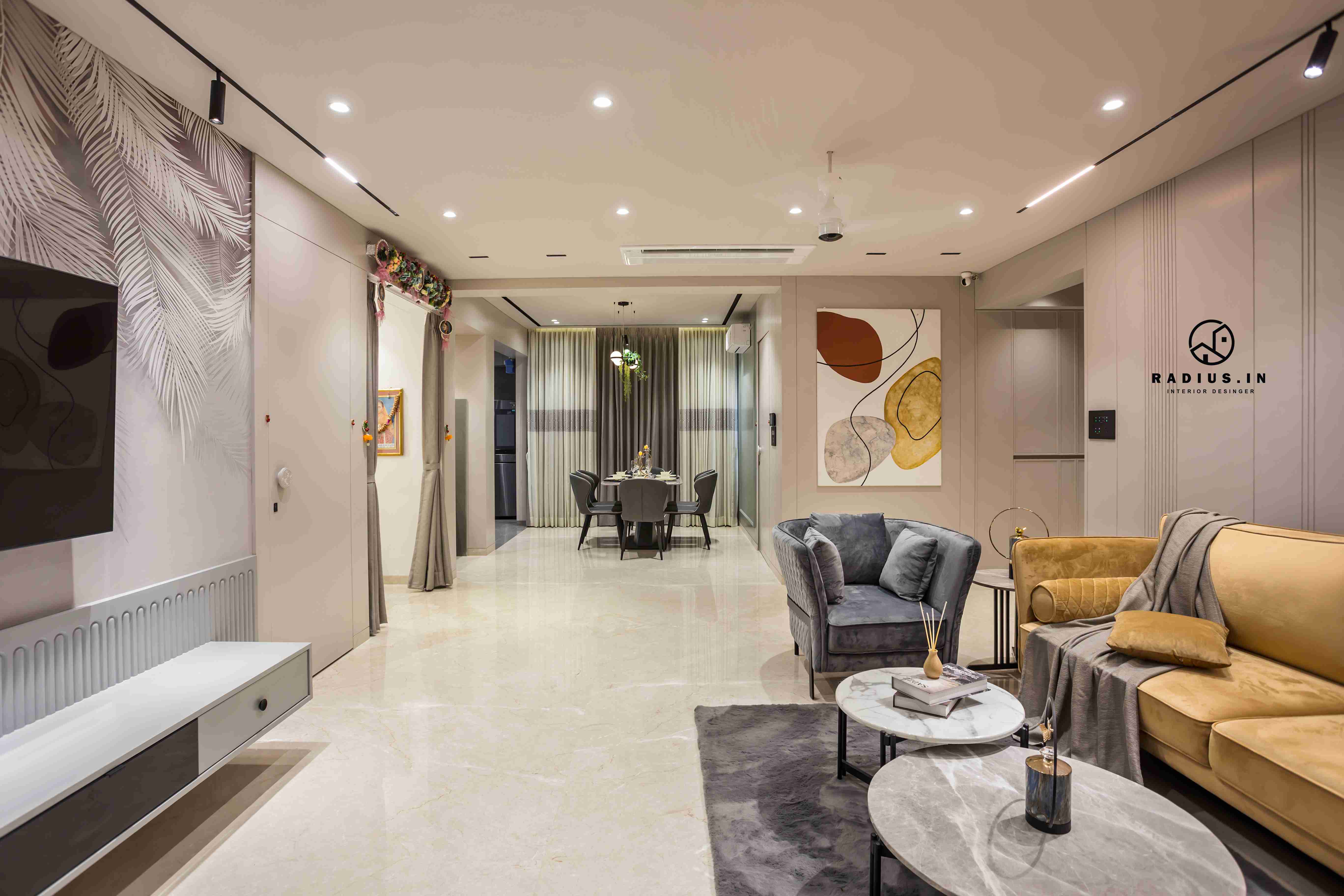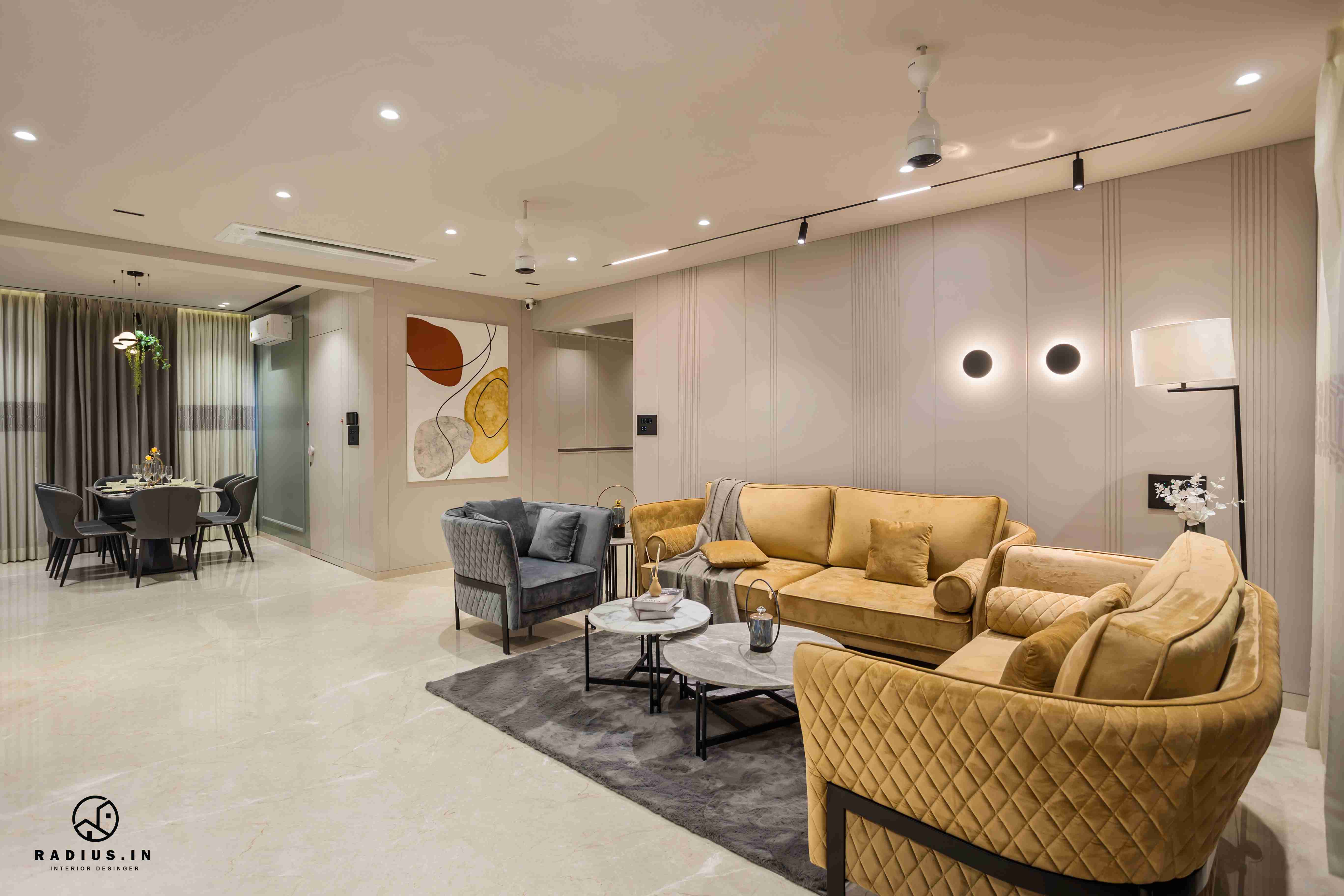 The usage of wallpaper in the living room conveys a free spirit. The living room's sofa is seamlessly incorporated within the panelled wall following the room's neutral colour scheme. The canvas painting and carefully chosen wall lights and the plated wall along with contemporary furniture allows the interweave which is elemental in facilitating the expressions of the ideas and emotions of our client.