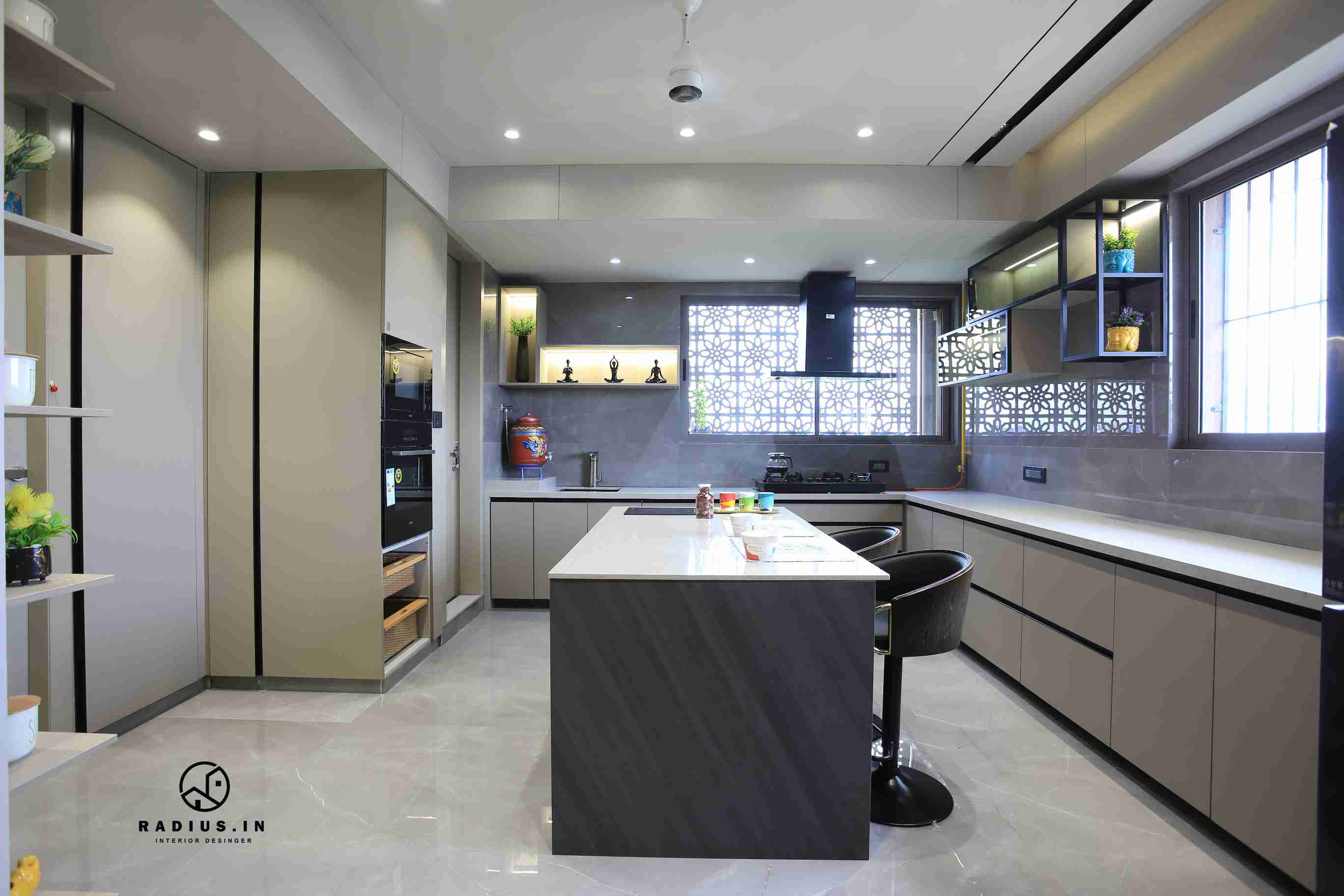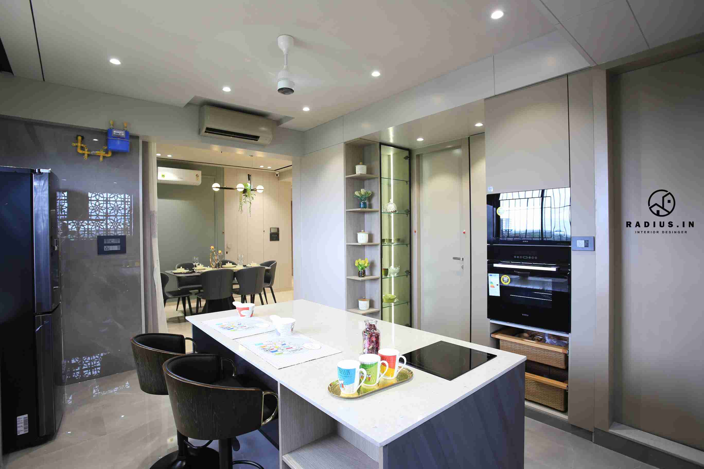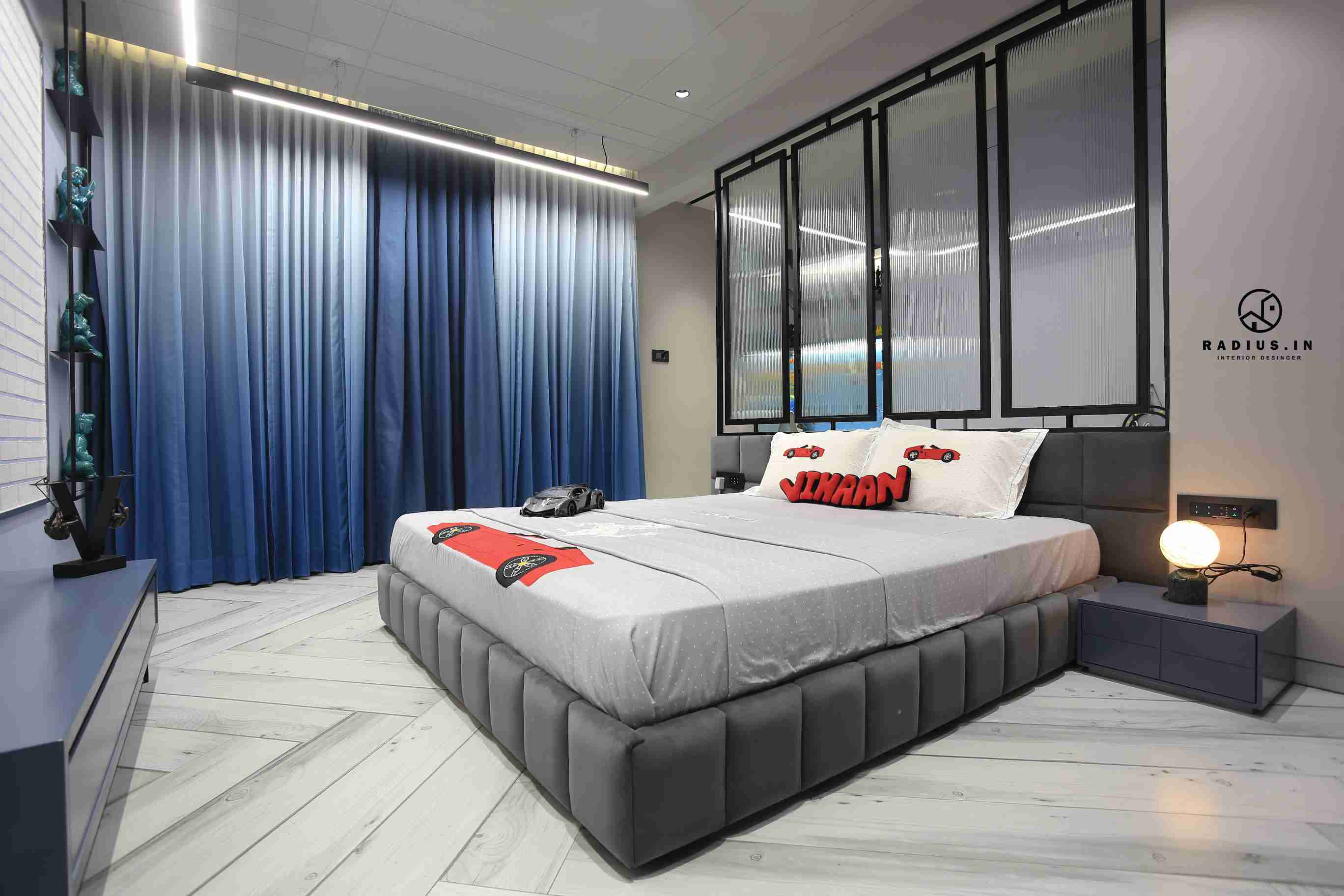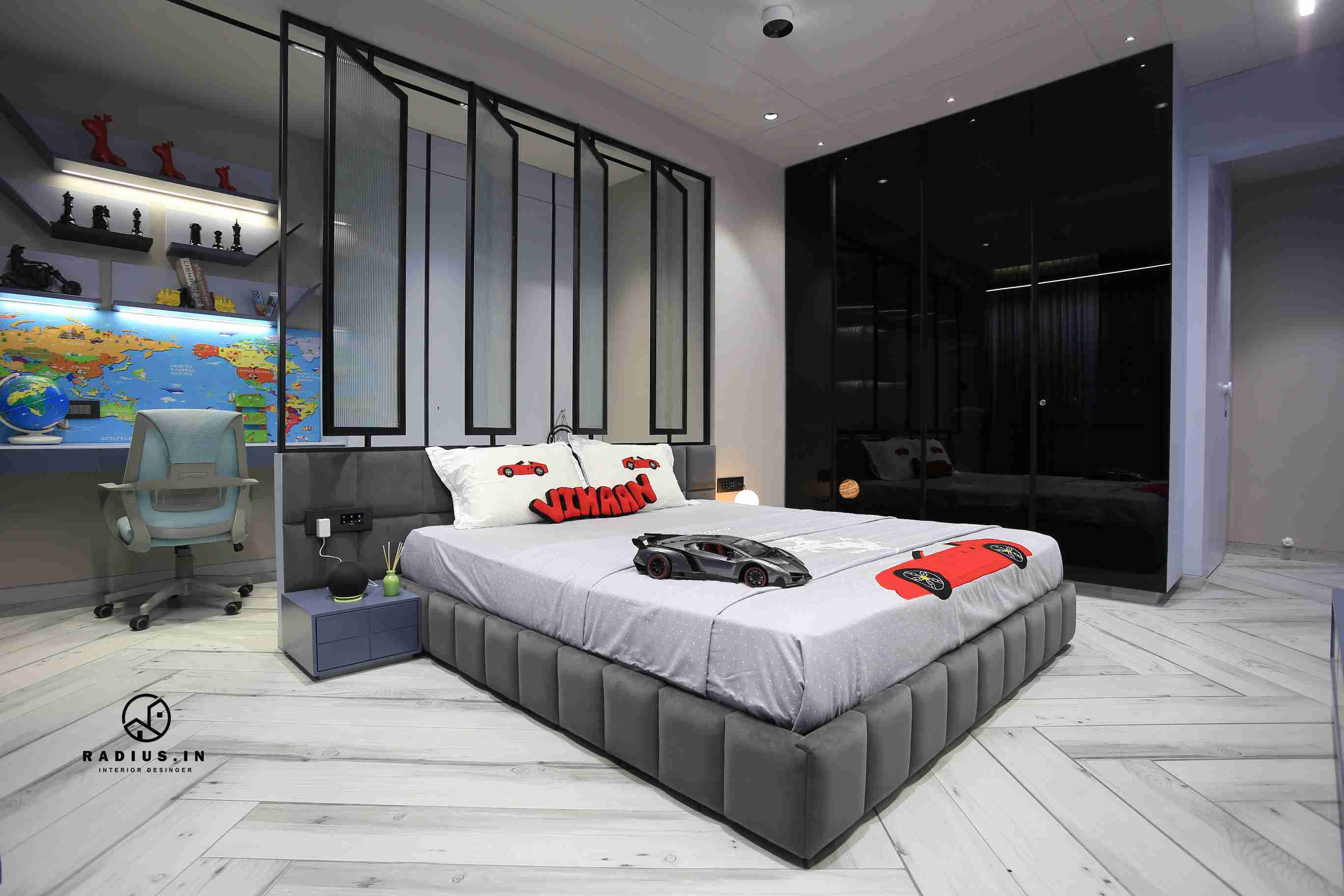 In the kitchen, we wanted to break up the monotony of black and white by adding a burst of colour that would match with the overall theme. After all, delicious food should originate from a cook who enjoys using this space to prepare meals. . A metal frame with a linear glass partition that beautifully divides the room into two depictions, various hues of grey, hanging profile lights, and other modern children's bedroom features make the space fascinating.