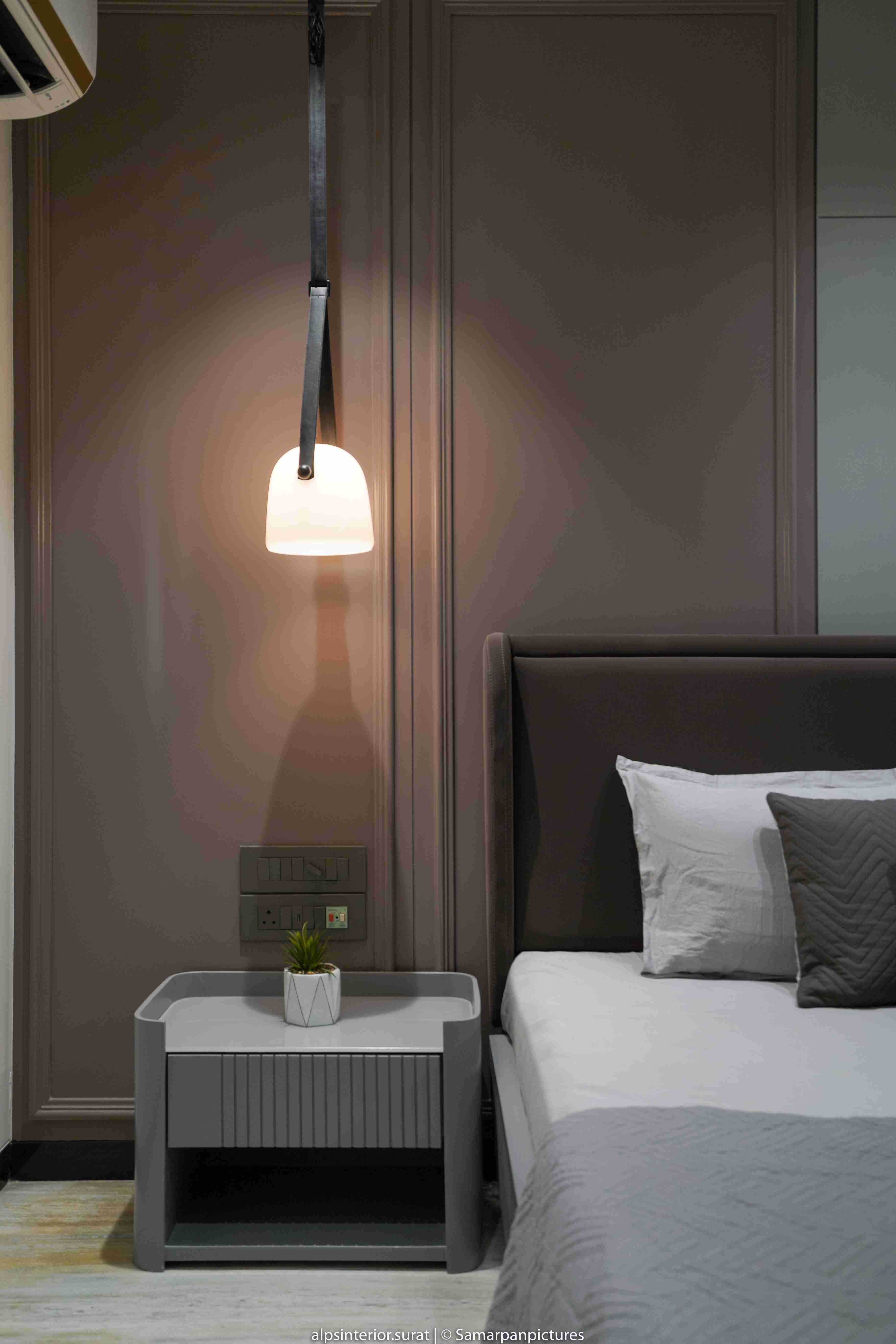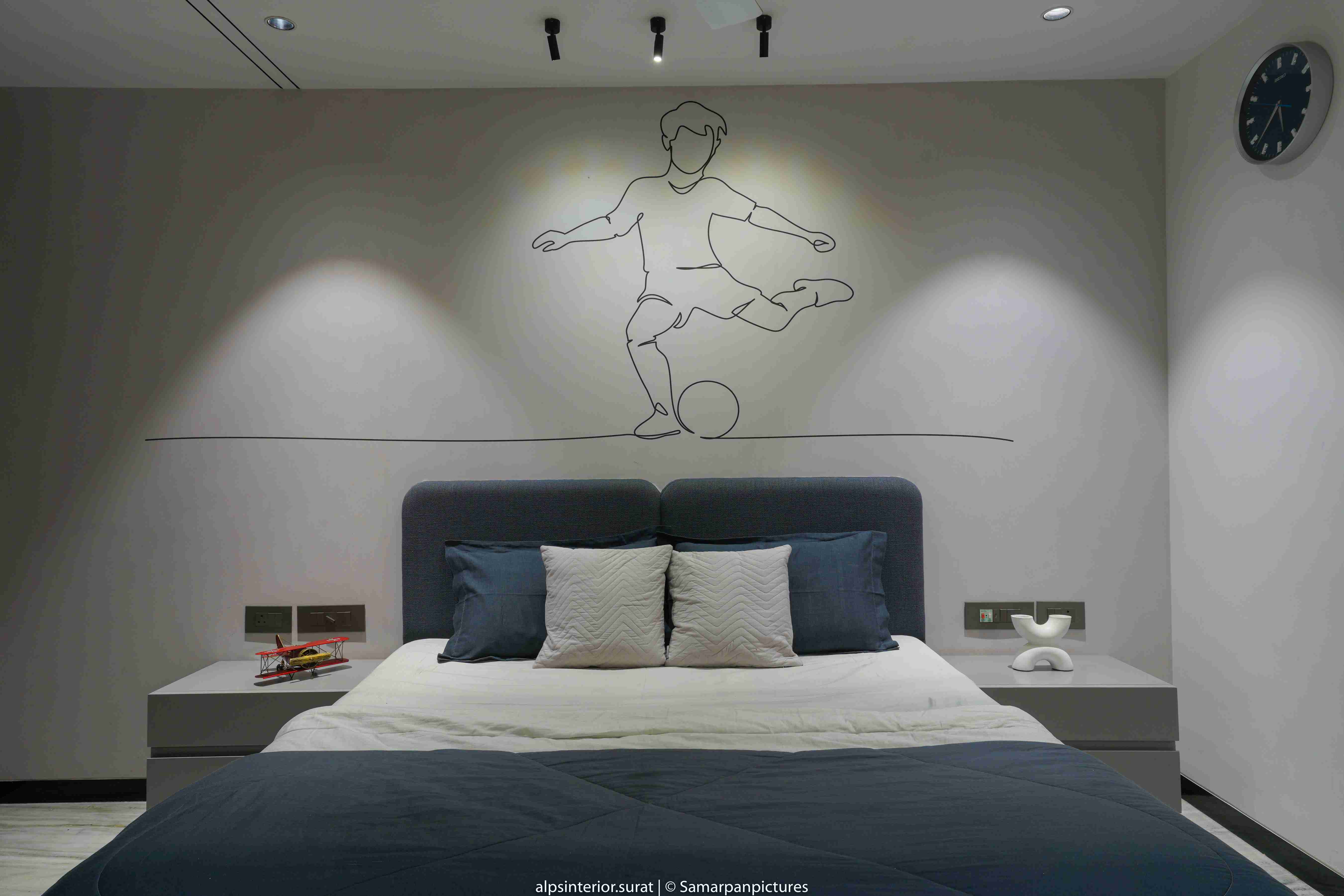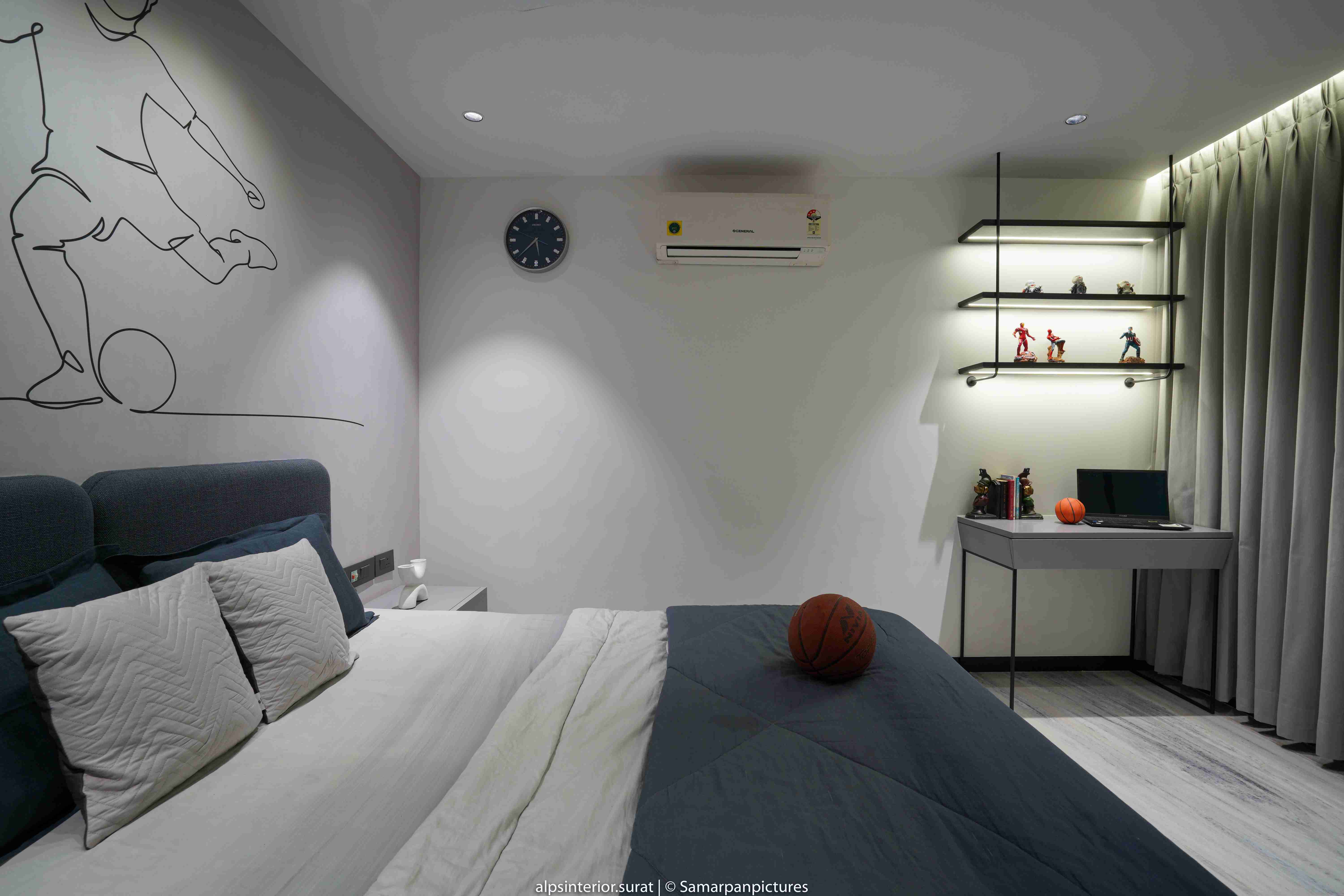 The light marble flooring and the off-white fluted and black tiled panel create a more open and relaxing atmosphere. This is further accentuated by the veneer-covered entry wall and closet in the master bedroom. This adaptable and progressive environment curated for the daughter masterfully strikes with a bold and bright energy thanks to its minimalist design in muted shades of grey and mauve that is enlivened by splashes of colour and texture in the form of antiques and paintings. This pleasant bedroom's design was expertly planned to reflect the son's personality, who is passionate about soccer and has modest taste. Even though each room has its own unique aesthetics, all the parts of the house work together beautifully to make a gorgeous house. With a variety of artistic textures, the walls give off an aesthetic appearance and feel, which helps to promote calmness and zen. With its walls covered in a light grey hue, the area anchors a uniform aspect and aesthetically unifies the space.