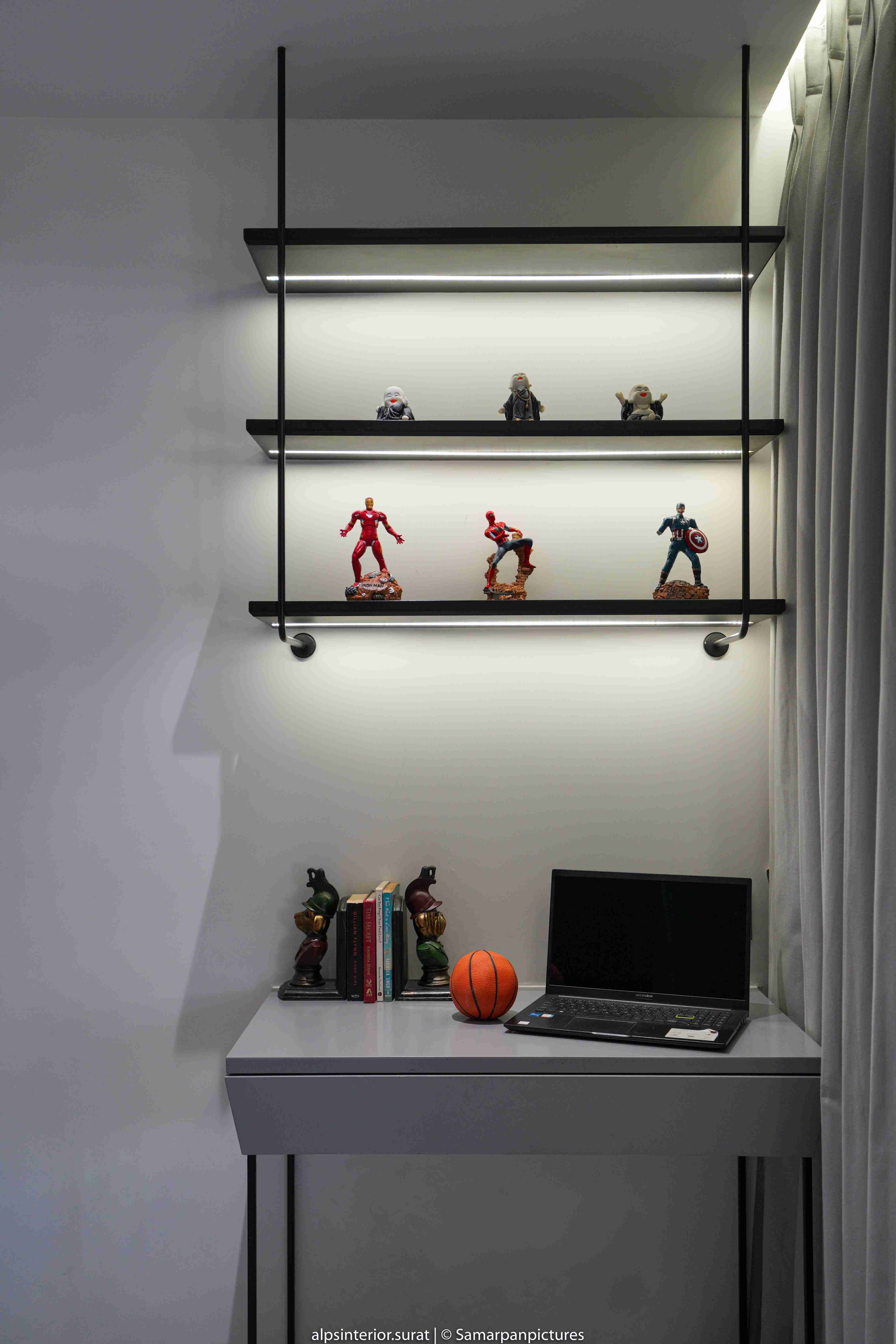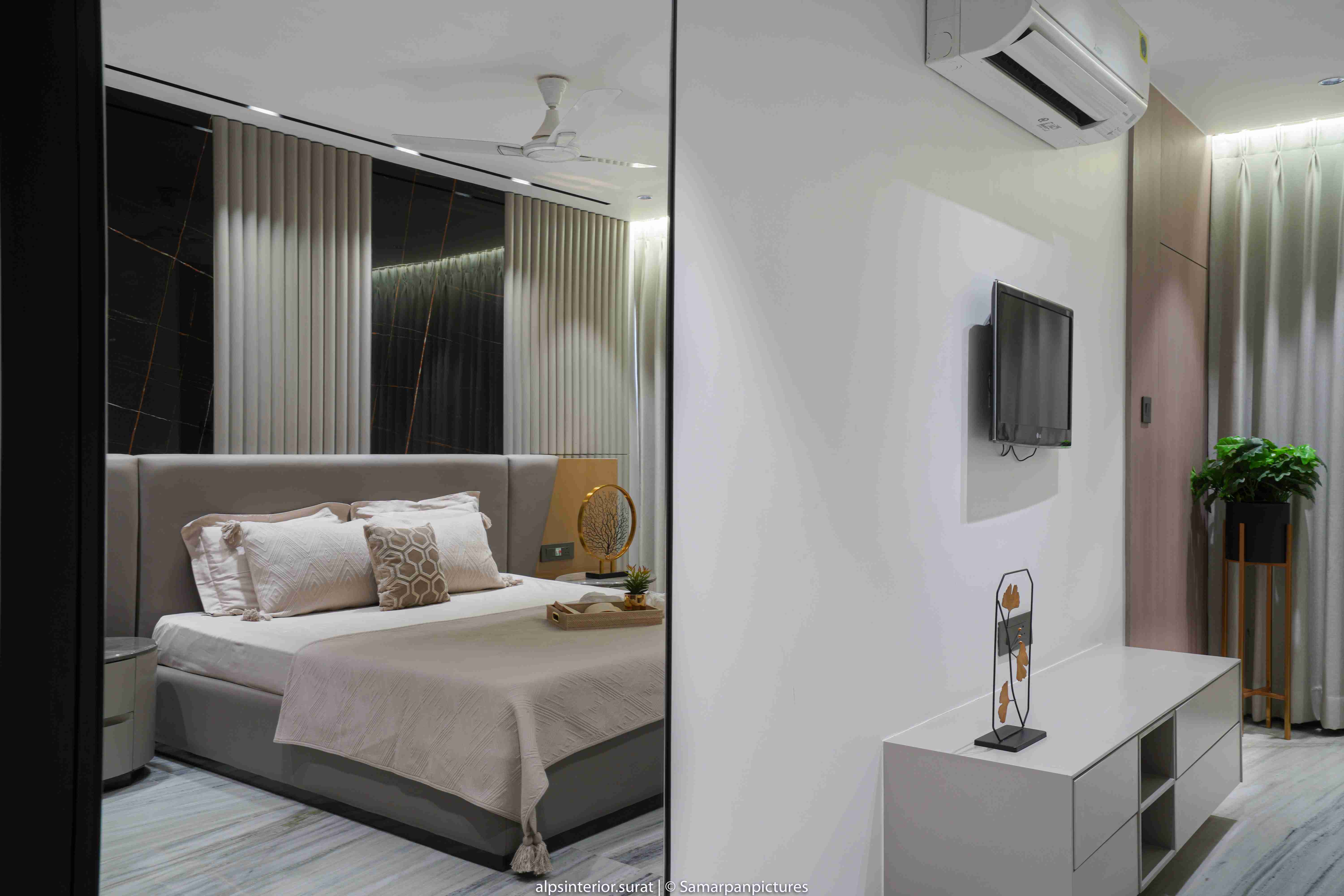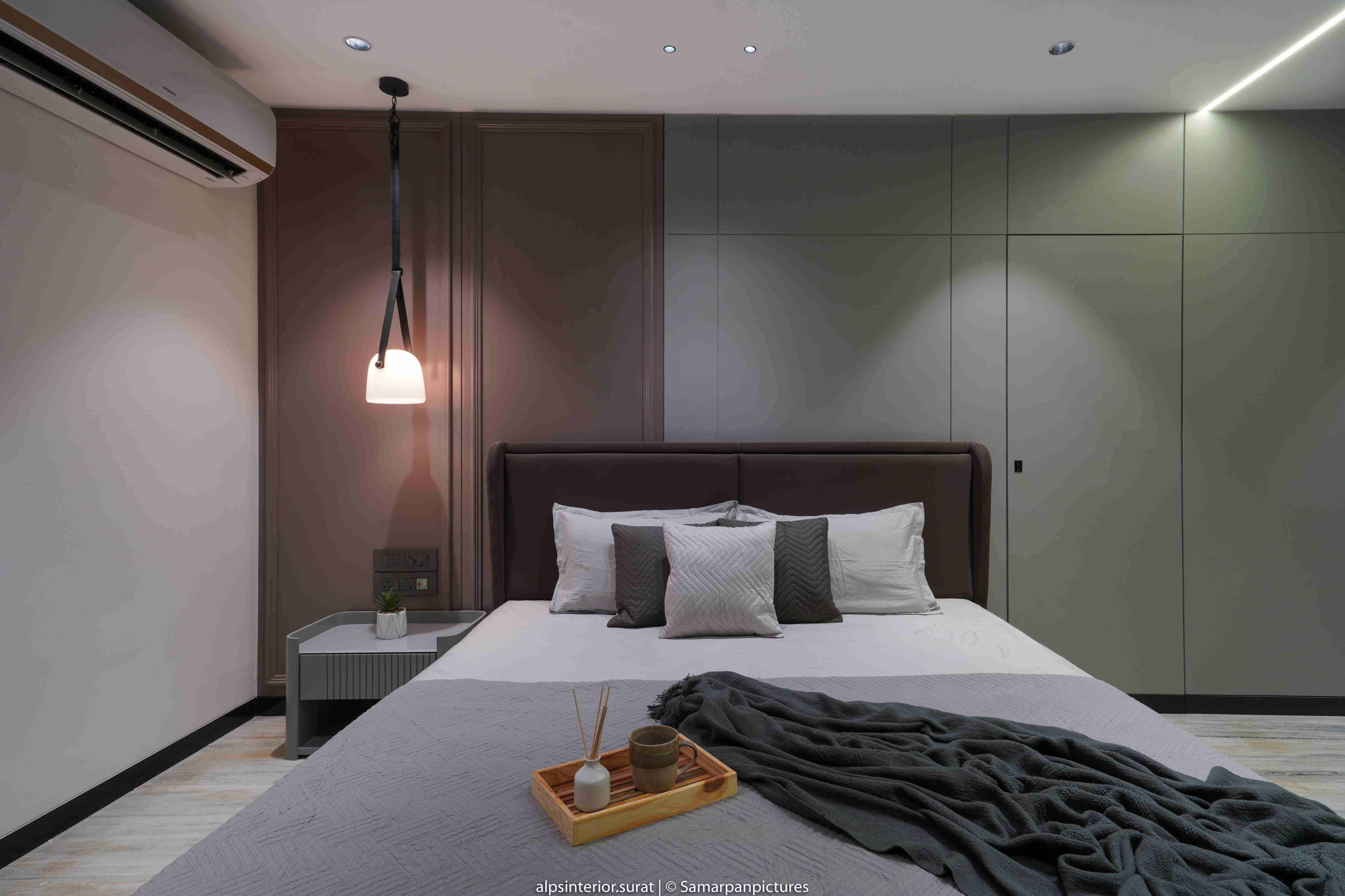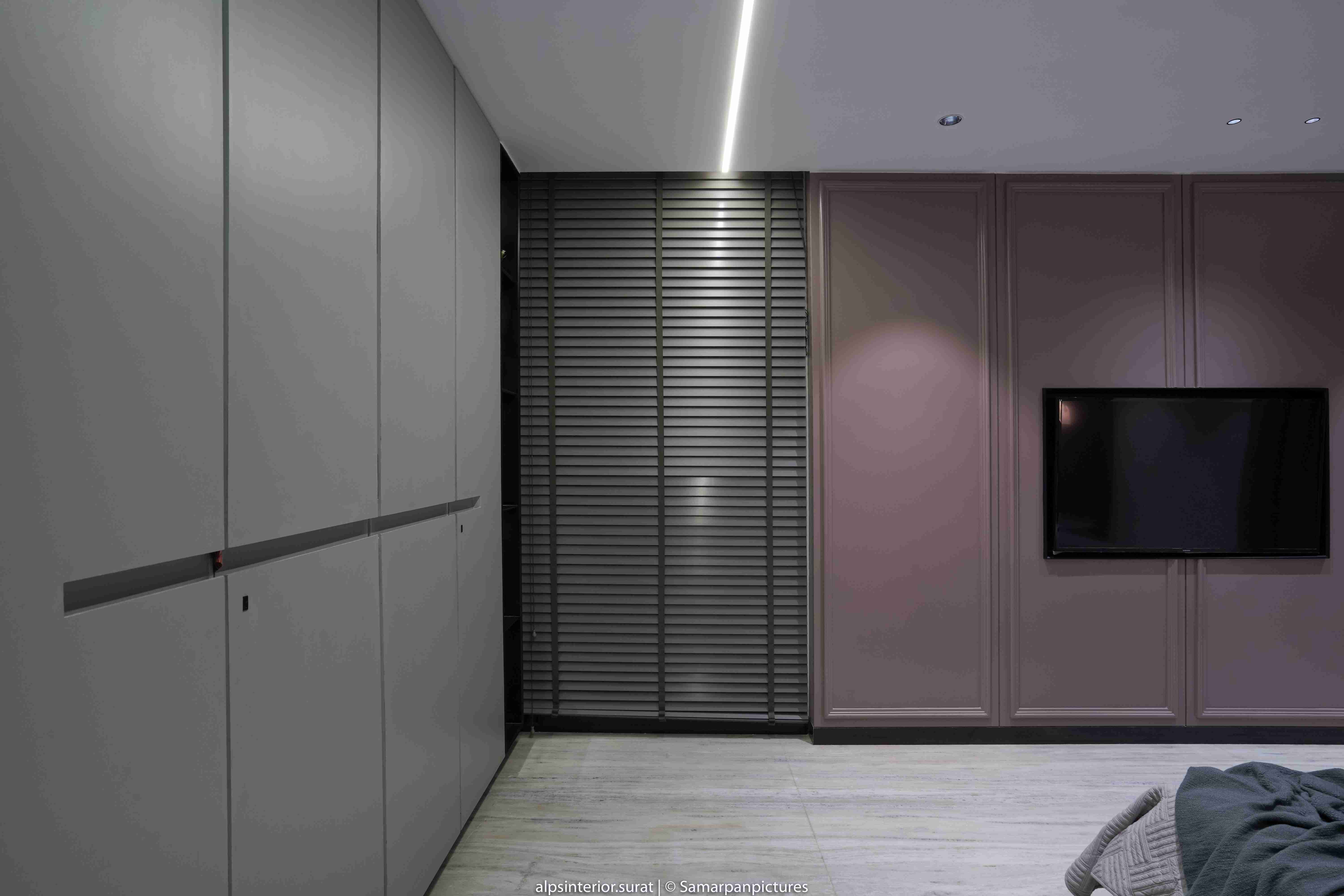 The light marble flooring and the off-white fluted and black tiled panel create a more open and relaxing atmosphere. This is further accentuated by the veneer-covered entry wall and closet in the master bedroom. This adaptable and progressive environment curated for the daughter masterfully strikes with a bold and bright energy thanks to its minimalist design in muted shades of grey and mauve that is enlivened by splashes of colour and texture in the form of antiques and paintings. This pleasant bedroom's design was expertly planned to reflect the son's personality, who is passionate about soccer and has modest taste. Even though each room has its own unique aesthetics, all the parts of the house work together beautifully to make a gorgeous house. With a variety of artistic textures, the walls give off an aesthetic appearance and feel, which helps to promote calmness and zen. With its walls covered in a light grey hue, the area anchors a uniform aspect and aesthetically unifies the space.
